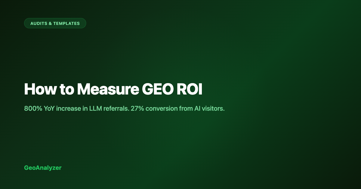 GEO performance is measured across three dimensions: visibility (citation rate, AI share of voice, brand mentions in AI responses), engagement (AI-driven impressions, referral traffic quality), and authority (how AI systems perceive your brand). Key benchmarks: AI search traffic converts 4.4 times better than traditional organic. Early adopters report 800% year-over-year increase in LLM referrals and 27% conversion rates from AI-sourced visitors.